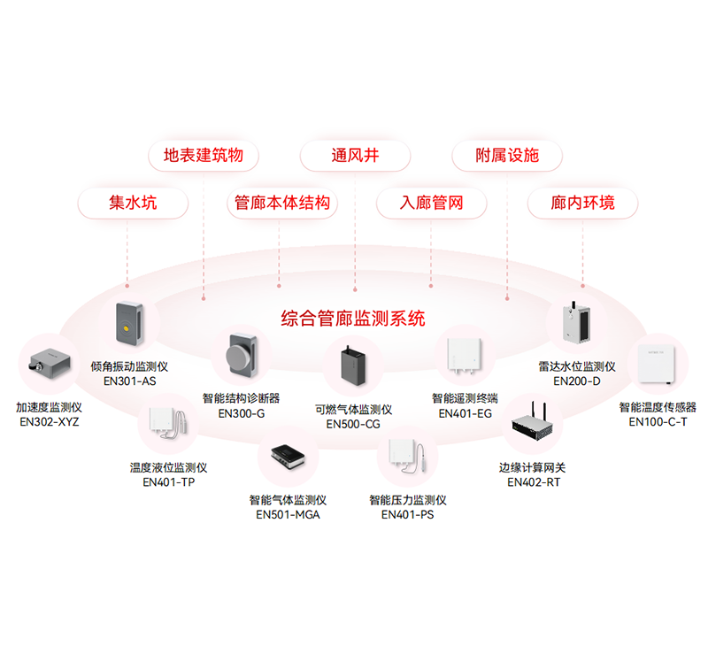 對管廊艙內(nèi)結(jié)構(gòu)的沉降、傾斜、震動和裂縫,管廊地表結(jié)構(gòu)沉降、位移和傾斜,管廊艙內(nèi)硫化氫氣體、甲烷氣體、溫濕度和氧氣,集水坑水位和孔口蓋板等數(shù)據(jù)實時監(jiān)測,同時接入視頻圖像,為管線風(fēng)險監(jiān)測預(yù)警分析、廊內(nèi)環(huán)境及附屬設(shè)施監(jiān)測預(yù)警分析和管廊綜合監(jiān)測預(yù)警分析提供數(shù)據(jù)支撐。